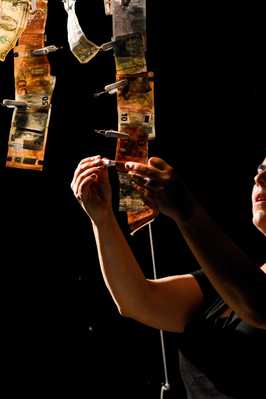 Wenigstens mal einen Euro richtig sauber machen. Wenigstens ein bisschen. Fünf Musiker*innen und Performer*innen unternehmen den Versuch, sich aus der persönlichen Verstrickung in weltweite Kapitalströme zu befreien, in dem sie ihr eigenes Geld waschen. Am liebsten würden sie alles Geld aus allen Banken ausleihen, waschen und zurückbringen. Und am besten auch gleich noch für die großen internationalen Geldströme im virtuellen Raum irgendwo ein Klärwerk bauen. – Doch schon beim ersten harmlosen Cent aus einer Kindersparbüchse lassen sich die Spuren von Korruption, Krieg, Kolonialismus, Ausbeutung, Waffenexporten und Genozid nicht entfernen. Trotzdem wird alles versucht: So schön singen, dass jede Münze davon einfach sauber werden muss. Waschgänge in Maschinen verschiedener Jahrgänge – darunter eine Miele von 1903. Kritische Auseinandersetzung mit dem Glauben ans Geld. Reflexion der eigenen finanziellen Biografie. Scheine lieber für eine Weile vergraben. Münzenschütteln in einer Balalaika.